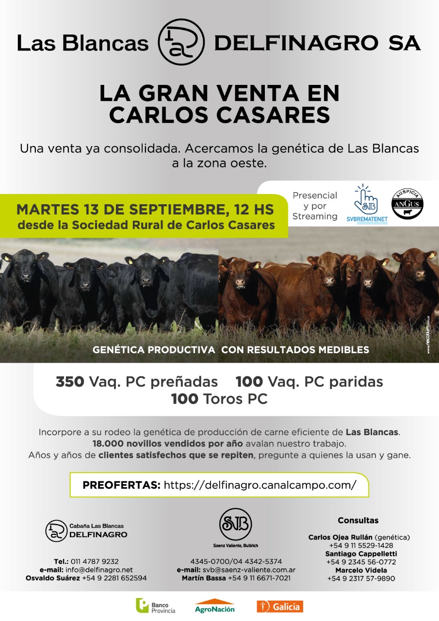 Remate "Las Blancas" | Miércoles 13 de septiembre | Modalidad: Remate físico y vía streaming | 12hs. | Carlos Casares, Buenos Aires | Remata Saenz Valiente, Bullrich & Cía. S.A.
