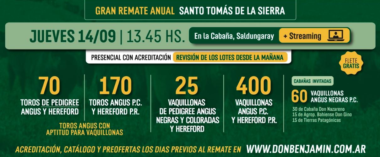 Remate "Don Benjamín" | Jueves 14 de septiembre | Modalidad: Remate físico y vía streaming | 13:45hs. | Saldungaray, Buenos Aires