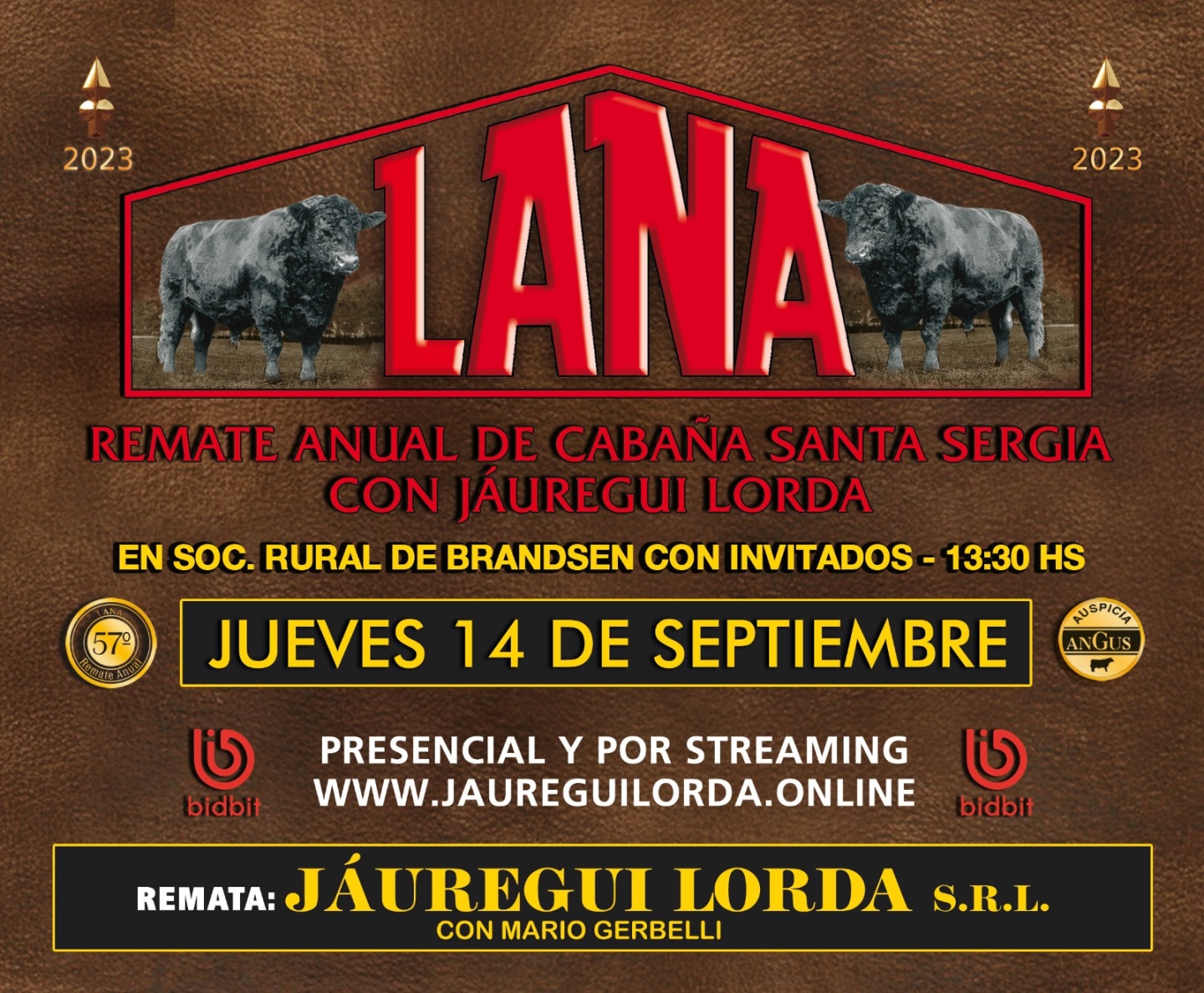 Remate "Lana - Santa Sergia" | Jueves 14 de septiembre | Modalidad: Remate físico y vía streaming | 13:30hs. | Brandsen, Buenos Aires | Remata Jauregui Lorda SRL