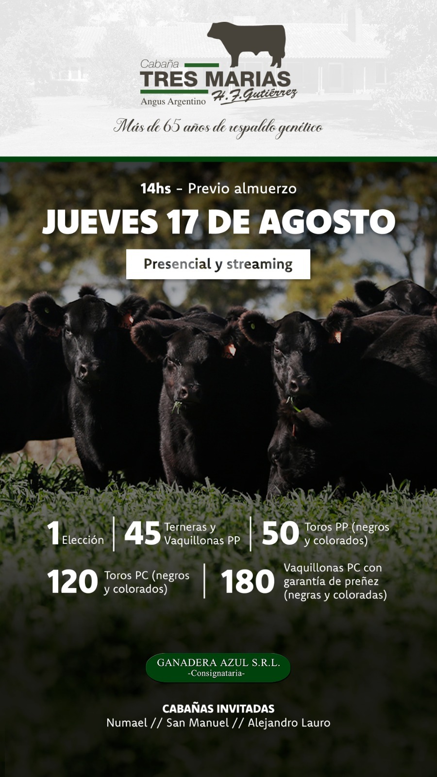 Remate "Tres Marías" Jueves 17 de agosto de 2023. 14hs. Coronel Bunge, Buenos Aires. Remate presencial y por streaming