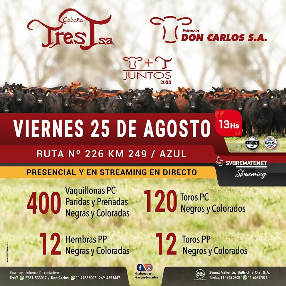Remate Juntos "Tres t y Don Carlos". Viernes 25 de agosto de 2023 13hs. Azul, Buenos Aires. Remate presencial y por streaming