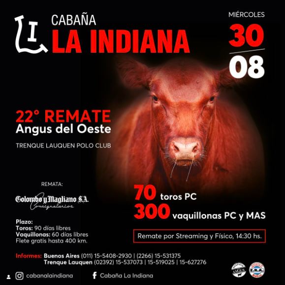 Remate "La Indiana" miércoles 30 de agosto de 2023 14:30hs. Trenque Lauquen Polo Club. Remata: Colombo y Magliano S.A. Remate presencial y por streaming