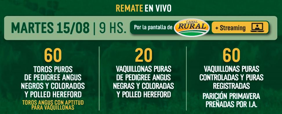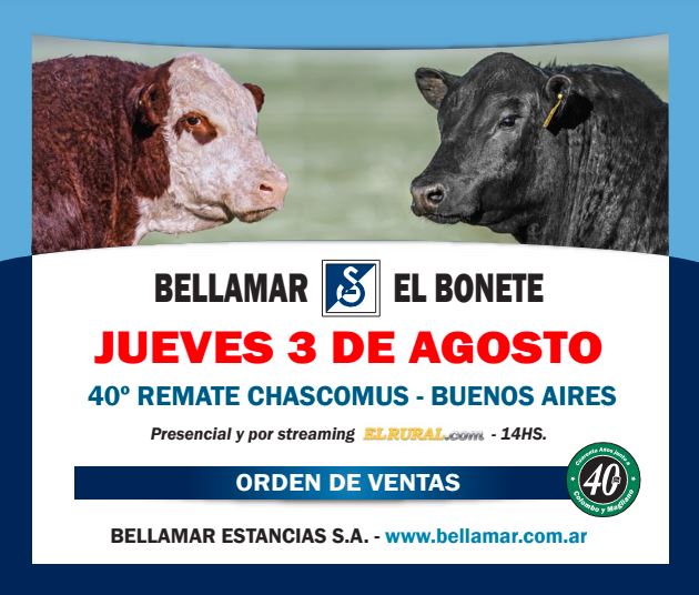 Remate "El Bonete". Jueves 3 de agosto de 2023, 14hs. Ubicación Chascomús - Buenos Aires 9:30hs. Transmitido por Canal Rural
